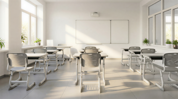 清新简约的教室,柔和阳光洒落,书包与文具静置桌上,营造舒适实景感。
