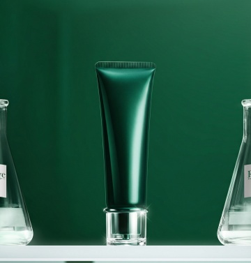 一支淡绿色护肤软管(#B5E0D3)立于晶莹水滴之上,水滴下方是天然石块底座,悬浮在浅青绿色背景(#E0F2F1)中,背景有模糊的白色与淡粉花朵,柔焦散景,光线从左上方斜射,形成清晰倒影与光束,极简美学,清新自然,高级摄影风格,3:4竖版构图