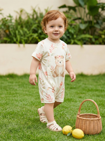 水彩风插画熊与花卉图案,轻拟物设计,清新可爱,简约温馨,夏日户外童趣场景。