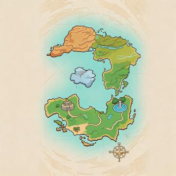 卡通感插画风岛屿地图,拟人化地形与手账风细节结合,水彩质感背景,虚拟现实探险主题,节日氛围浓厚。