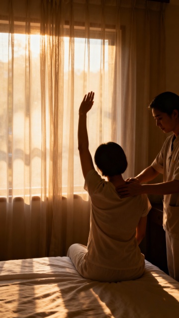 轻拟物风融合油画质感,柔和光影勾勒温馨按摩场景,实景感十足,传递舒适疗愈氛围。