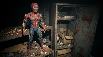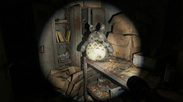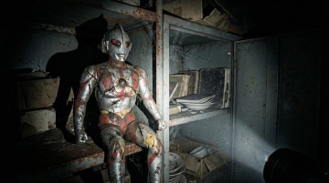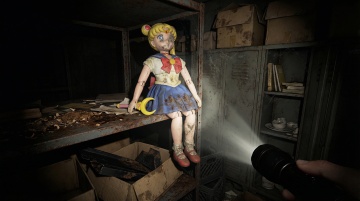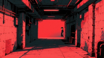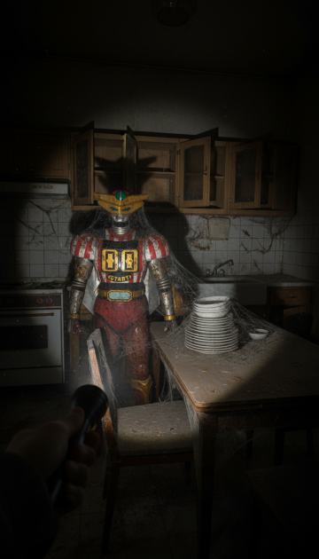 整体为暗黑复古颓废风,色调以灰褐、冷黑为基底,仅以玩偶马甲残留的褪色赤红与牛仔裤的暗淡藏蓝作为局部微弱点缀;氛围核心是 “童年怀旧” 与 “荒废诡异” 的强烈碰撞,突出岁月侵蚀的破旧质感、封闭空间的窒息压抑感,以及 “光束内清晰、光束外黑暗” 的未知惊悚感。