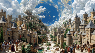 水彩风插画,梦幻感超现实主义设计,人物站在书堆上仰望灯塔,象征知识的光芒。