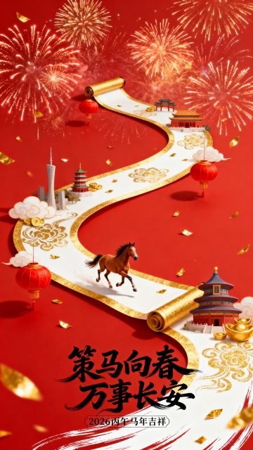 国潮风融合微缩艺术,鎏金卷轴铺展长安盛景,剪纸风格建筑与奔马呼应,水墨笔触点缀,红金配色尽显喜庆与中式韵味,烟花绽放贺丙午马年。