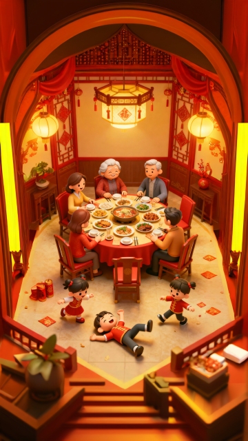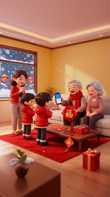 软3D风插画,毛发生长质感营造温馨喜庆氛围,卡通家庭围坐赏雪景,红灯笼与烟花点缀元旦夜,充满节日温暖与童趣。