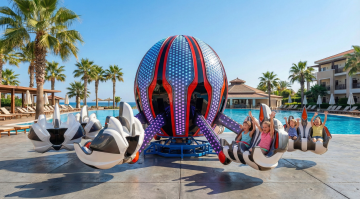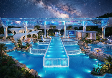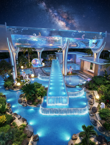 在图片1的基础上,室外的星空主题的儿童戏水池,高大的水滑梯,星空宇宙主题火箭筒或者宇宙飞船主题的高大水滑梯,造型充满奇幻想象,铺装上点缀星座灯串联元素,戏水池靠边的地方有曲线异形的儿童主题活动墙,星空主题的景观小品在周围,现代简洁干净的景观风格,背景的植物后隐约可以看到建筑的一角,建筑是一层高的现代简洁白色建筑物,明亮的灯光营造,整体画面配色保持干净清爽中有儿童的活泼氛围,充满张力的构图视角,4张图片