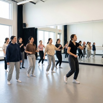 一群年轻人(大多是女生)正在跟练舞蹈,大家穿着休闲舒适的穿搭(T 恤、运动裤等),动作整齐地抬手伸展五,现代风格的舞蹈室,明快的颜色