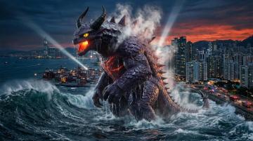 超现实主义巨兽破海而出,3D重拟物风塑造金属质感鳞甲,粒子特效渲染喷发烟雾,冲击感十足的城市夜景背景,虚拟现实级视觉震撼。