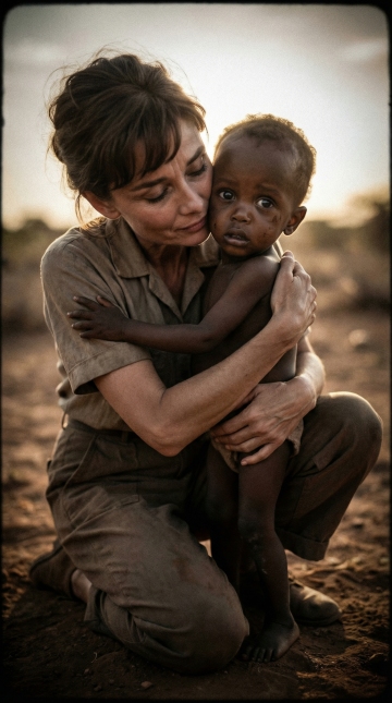 [特写,低角度镜头],索马里,奥黛丽·赫本半跪在泥土地上,双臂紧紧环抱一个瘦弱不堪、眼神空洞的幼童,她的侧脸紧贴孩子脸颊,双眼紧闭,表情充满痛惜与无限温柔,[侧逆光勾勒相拥轮廓,面部处于柔和阴影中],深棕色与肤色,情感浓烈,极浅景深,胶片颗粒感,轻微暗角,电影帧定格情绪瞬间,参考《蒂凡尼的早餐》前传式纪实质感,图片规格9:16。竖版,