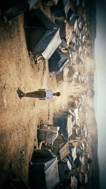 [全景,俯视镜头],埃塞俄比亚难民营,奥黛丽·赫本身着白色棉质衬衫与卡其裤,穿越干旱土地与简陋帐篷,身影在广阔而荒凉的景致中显得坚定而渺小,[强烈高原顶光与扬尘下的漫射光],土黄、灰蓝与一抹亮白色,高对比度,浅景深,胶片颗粒感,轻微暗角,电影帧定格情绪瞬间,参考《蒂凡尼的早餐》前传式纪实质感,图片规格9:16。竖版,