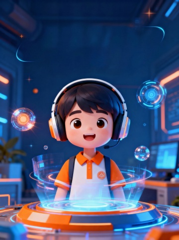 科技感十足的3D重拟物风设计,融合霓虹灯与金属质感,展现未来AI教育场景,虚拟现实元素点缀,突出商务与创新氛围。