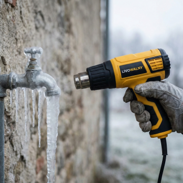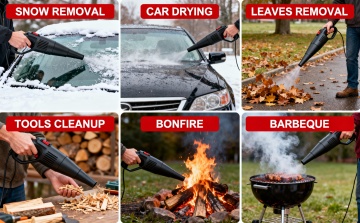 一位欧洲白人男性在户外烧烤的情景。主体位于画面的左侧,是一位年轻的男性。他用右手拿着一把黄黑配色的热风枪,正对着烧烤架里的炭火,试图点燃它们。烧烤架位于画面的右侧,架内有燃烧的炭火,火焰明亮,呈现出橙色和黄色。背景模糊,包括绿色的树木、灰色的建筑物和红色的车辆。拍摄角度略低,整体氛围轻松随意,带有户外休闲感。光线明亮,来自上方。照片色彩鲜艳,对比强烈。