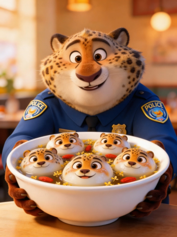 3D卡通角色,拟人化警猫手持汤碗,碗中浮着五颗萌趣豹脸汤圆,蛋黄流出形成笑脸,节日氛围浓厚,趣味十足。