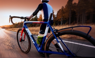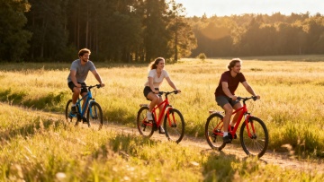 四位骑行者在陡峭的山路上骑行,他们穿着专业的骑行服,戴着头盔,正在奋力向上攀登。阳光从他们身后照射过来,在崎岖的山路上投下长长的影子。天空湛蓝,白云朵朵,远处的山峰连绵起伏,山上覆盖着茂密的森林。骑行者们的身影在山间小路上显得格外渺小,但他们的姿态充满了力量和决心,展现出挑战自我、超越极限的体育精神。