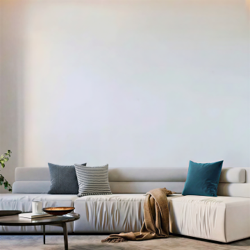现代极简风格室内场景,以浅灰色调为主,明亮通透的客厅空间,大面积落地窗引入柔和自然光,窗纱轻盈飘逸,窗外可见绿色植物,地面铺设浅色大块瓷砖,中央铺放一块米白色带有细密纵向条纹纹理的柔软地毯,地毯占据画面主要视觉区域,特写其细腻的编织质感与光影下的微妙明暗变化,前方摆放一张浅灰色布艺沙发,线条简洁,带有横向褶皱设计,沙发上放置几个同色系靠垫,沙发旁有一个圆形金属框架小茶几,墙面简洁,挂有一个小型装饰画框,整体氛围宁静、舒适、高雅,空间布局开阔,留白充足,呈现出简约而不失格调的现代家居设计感。