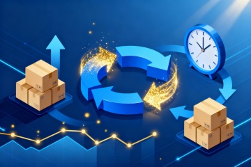 等距3D风格物流仓库场景,现代化单层仓库建筑,蓝色屋顶搭配浅灰色墙面,橙黄色大型货运卡车停靠在仓库旁装卸区域,地面上分布多个棕色纸箱、橙色和红色集装箱,几位穿着绿色背心的工人正在使用叉车搬运货物,整体采用明快的蓝、橙、灰配色方案,简洁的几何造型,清晰的轮廓线条,明亮均匀的光影效果,营造出高效、有序的物流仓储氛围。
