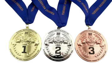超写实主义风格,三枚奖牌从左至右水平排列,左侧为金黄色金牌,中央嵌有立体数字“1”,边缘呈放射状锯齿形,顶部有高光白点;中间是银白色银牌,中央为立体数字“2”,边缘同样为放射状锯齿形,顶部有高光白点;右侧为铜色铜牌,中央是立体数字“3”,边缘放射状锯齿形,顶部有高光白点。每枚奖牌下方悬挂着红色丝带,丝带呈对称的倒V字形垂落,整体画面背景为纯白色,色彩鲜明,金属质感强烈,光影过渡自然,细节精致,立体感十足。