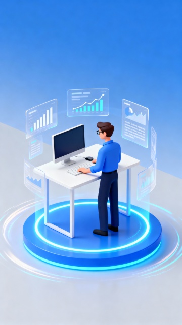 3D风格的宣传界面,画面的主体居左,主体是一个带有图表、数据模块等元素的白色立体分层面板,周围漂浮着蓝色统计图表形状物件,玻璃磨砂质感。画面右侧留白。整体色调以白色为底,搭配蓝色元素,背景是炫彩浅蓝色,呈现出简洁、现代、科技感的视觉效果