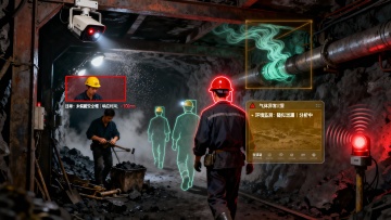 一名矿工正手持工具试图清理,但堆积速度较快。在设备的关键位置,坚固的防护外壳内安装着AI摄像机和激光测距传感器,传感器发出不可见的扫描线,持续监测着堆积物的轮廓与高度。