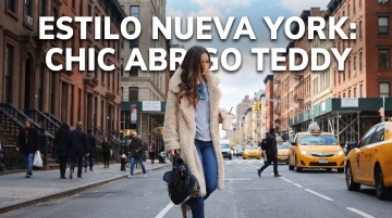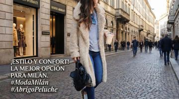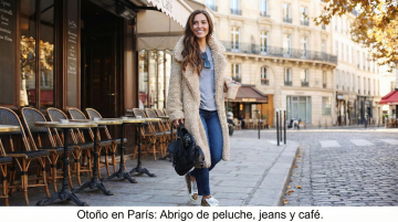以图中的女士休闲毛绒翻领大衣为元素,欧美年轻女人穿着大衣,设计6张跟女士休闲毛绒翻领大衣有关的图,物体主体特征不变,西班牙语,比例 「16:9」