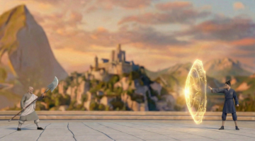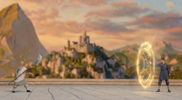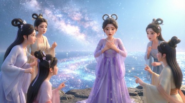 国漫 3D 卡通风格,老牛抬头望向天空,眼神温和,牛角泛着淡淡的光泽,牛郎站在老牛身旁,一脸疑惑地顺着老牛的目光看去,背景是傍晚的红霞,色调温暖柔和