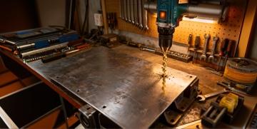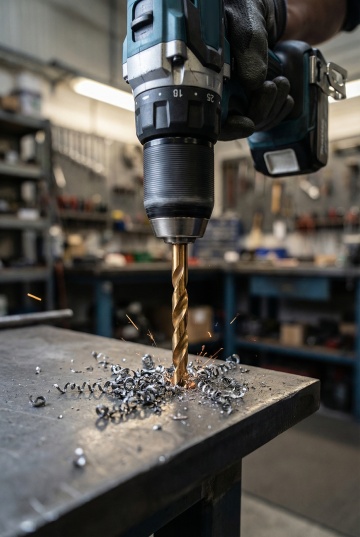 工人戴着红色皮手套的专业焊工在钢梁上进行 MIG 焊接,充满活力的橙色焊接火花逼真地飞舞,头盔遮阳板放下,工业车间环境背景中有金属制造工具,火花上的运动模糊,焊接电弧发光的真实照明,详细的手和手套纹理,动作镜头,摄影由 Peter Hurley 拍摄。