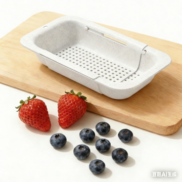 一张 塑料可调节的【米色沥水篮】 照片/电商产品图,要求对这款米色可调节沥水篮进行颜色修改,将其变为【白色】,材质是小麦秸秆材质,同时保持产品主体和样式细节不变