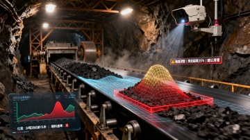 整体画面强调在昏暗、复杂且动态的混行环境中,AI系统如同一位全知的“交通指挥员”,能实时厘清人车位置关系,精准预测碰撞风险,并即时标记各类违规行为。科技感体现在这种对复杂动态场景的实时解构、风险评估与可视化能力上,将被动监控转变为主动预警,为井下狭窄空间的安全通行构筑起一道智能防线。色调以黑、灰为主,用绿、蓝、红色清晰界定不同状态与风险等级。