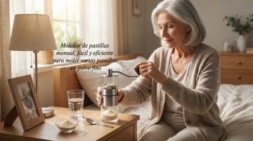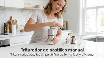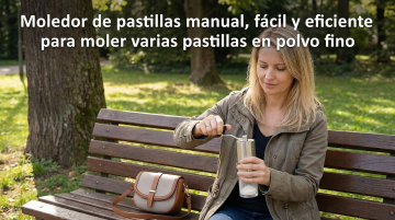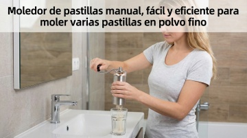 以图中的手动药片研磨器为元素,欧美女人使用手动药片研磨器,可轻松高效地将多片药片研磨成细粉,设计6张跟手动药片研磨器有关的图,物体主体特征不变,西班牙语,比例 「16:9」