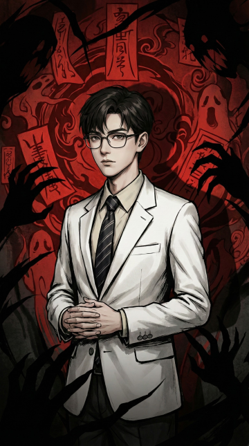 扩图,比例9:16,完善人物下半身细节,穿着西裤,完善细节,人物衣服上刻画烫金国风仙鹤,人物眉心的红线改成红色眼睛(参考图二)