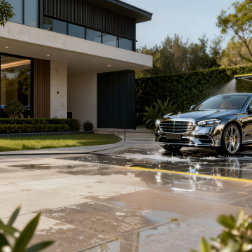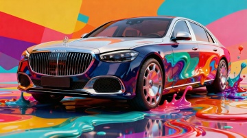 广角仰拍视角,一辆亮红色豪华SUV以富有力量感的45度角从画面左下角向右上方疾驰,流线型车身在阳光下反射出耀眼的金属光泽,22英寸多辐式轮毂裹挟着黑色柏油路面的动感模糊,扬起细微的碎石与胎痕。背景是玻璃幕墙林立的现代化都市天际线,摩天大楼的几何轮廓在由深邃钴蓝渐变为清澈天蓝的晴朗天空下显得格外挺拔,几缕被夕阳染成金边的白色云彩横向舒展。柔和的侧逆光勾勒出汽车锐利的腰线与车顶行李架,前大灯投射出两道明亮的光柱穿透空气中的微尘,地面倒影呈现出拉伸的红色光带。右下角保留空白区域,底部左侧虚化处理的路面细节隐约可见,整体构图遵循三分法则,以红与蓝的强烈对比展现速度与优雅的完美融合,光影层次分明,突出车辆的豪华质感与动态力量。
