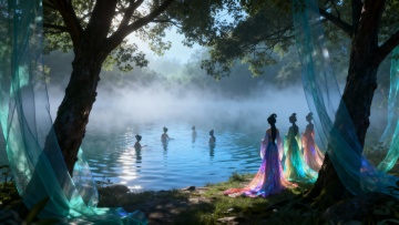 水墨风与工笔风交融,云海缭绕间仙人御剑飞渡,光影流转如梦似幻,清透朦胧中尽显中式美学意境。