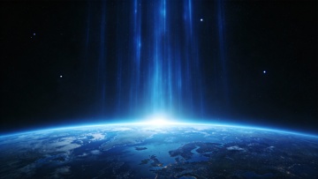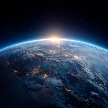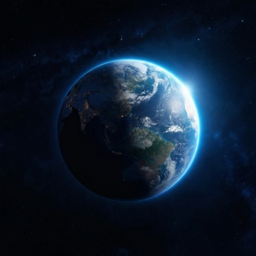 未来感与科技感交织的地球夜景,3D渲染呈现广阔宇宙视野,霓虹光点勾勒城市轮廓,粒子风光影流动,虚拟现实中的壮丽星球。