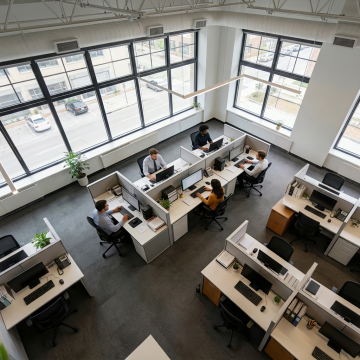 现代简约办公室,性冷淡风设计,大面积窗户引入自然光,营造清爽舒适的办公环境。