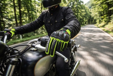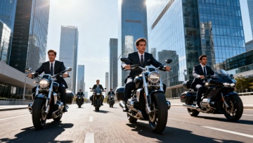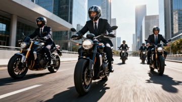 赛博朋克风夜景中,骑手疾驰于未来都市,金属质感机车与霓虹光影交织,头盔静置路面,虚实交错,科技感与酷炫感并存。