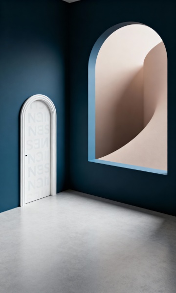 帮我生成五张类似背景,这是一个极简主义风格的室内场景3D渲染图,采用平视偏俯视的视角拍摄房间角落: 墙面为深邃的哑光藏蓝色,地面是干净的浅灰色哑光质感,两者形成沉稳的冷暖色彩对比;画面左侧墙面嵌入一扇白色的拱形门,门框带有轻微的立体凸起线条,门板表面有模糊的浅灰色文字纹理;画面右侧的墙面有一个大尺寸拱形开口,开口后方露出模糊的、肤色质感的曲面结构,增添空间的奇幻感;整体光线柔和均匀,没有明显强烈的明暗阴影,营造出静谧、简约又带有超现实氛围的空荡室内空间。