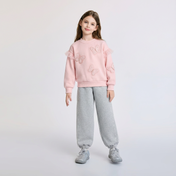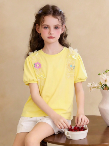 将图2中的第1件短袖T恤和短裤套装穿在图1的小女孩身上,衣服套装款式保持不变,图案保持不变,4K高清图