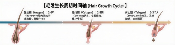 高度写实的3D医学解剖插画,皮肤多层结构的立体剖面展示,顶层有三根粗壮、乌黑、表面光滑的毛发从毛囊中长出,毛囊根部附着红色颗粒状物质,中层可见排列整齐的粉色圆形细胞结构,底层是黄色蜂窝状组织,其间分布着红色管状结构并向外渗透粉色微粒,整体色调以肉粉色、淡黄色、红色为主,光影柔和,立体感强,细节清晰,具有科学严谨的医学可视化风格,突出皮肤各层组织的微观结构和相互关系。