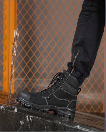 这个鞋子被美国男子穿着。轻徒步: 加州优胜美地国家公园(林间碎石小径(浅棕岩石 + 深绿松树),搭配清晨薄雾
