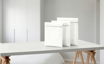 一个白色哑光材质的长方形自立袋包装,袋身中央有轻微的弧形内凹设计,边缘有一圈银色亮边,底部有细密的锯齿状压纹封口,整体呈现出简洁干净的包装设计感,高分辨率3D渲染效果,光影柔和,在白色背景下独立展示,具有现代简约的产品包装视觉风格。