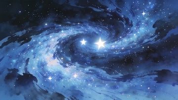 浩瀚星空银河横贯天际,璀璨星河流淌,左右两侧各有一颗特别明亮的星星隔河相望,星辉闪耀,中国风3D卡通国漫风格,深蓝夜空渐变至紫色,水墨质感云气缭绕,银河中心有漩涡光效