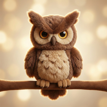 软3D风格的萌系猫头鹰,毛发生长细腻逼真,暖光背景营造温馨可爱氛围,适合节日治愈系视觉设计。