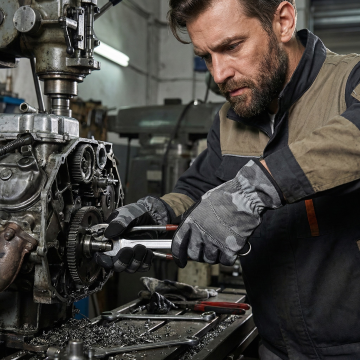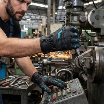 保持手套细节不变,分清正反面,一个外国帅哥穿着这双手套在操作重型机械