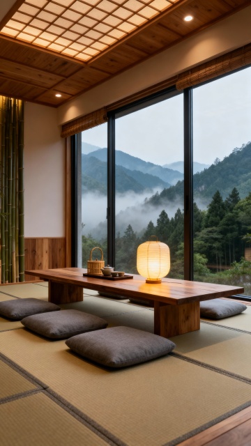 中式庭院,灰砖黛瓦,水墨意境。几何构图,石刻质感,静谧深远,雾山隐现,东亚古典美学与实景交融。