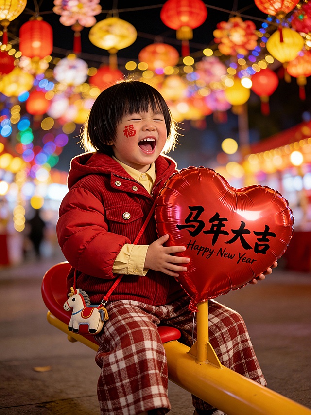 国潮风实景夜景,红衣童子手持“马年大吉”充气心形气球,笑靥如花,喜庆感十足,灯笼辉映,年味浓烈。详情