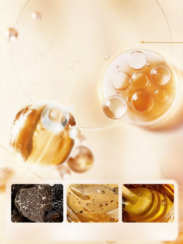 高清美妆分子动感背景,透明金色油状液体形成流畅飘逸的波浪形态,中心悬浮着包裹分子结构(由多个小圆球通过线条连接构成)的透明大油滴,周围散落着大小不一、带有高光和折射效果的金色油滴与气泡,整体呈现出轻盈灵动的流动感,采用柔和的米白色渐变背景,适当面积留白以增强空间感和高级质感,光影柔和,高光细腻,色彩以金色和透明色为主,营造出纯净、高端、科技感的美妆氛围。