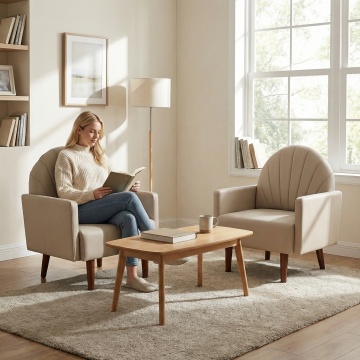 请根据图一参考图给图二沙发椅生成一张场景图,需要四个跟图二一样的椅子在添加一个茶几,需要在一个办公室的场景,尺寸要1:1的尺寸,不要改变图二沙发椅子的皮质质感和颜色