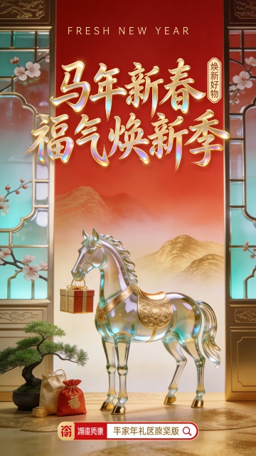 主体围绕鎏金琉璃马展开:骏马以鎏金嵌琉璃质感呈现,口衔焕新礼盒,立于带有梅花纹样的中式琉璃花窗前,花窗旁摆放新春绿植与福袋,背景是红金渐变的淡雾山峦,既贴合马年生肖属性,又强化 “新春焕新” 的活动核心。