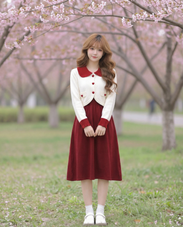 文艺复古风针织开衫,心形镂空细节,搭配简约黑裙,咖啡馆街拍场景,呈现优雅时尚的日常美学。