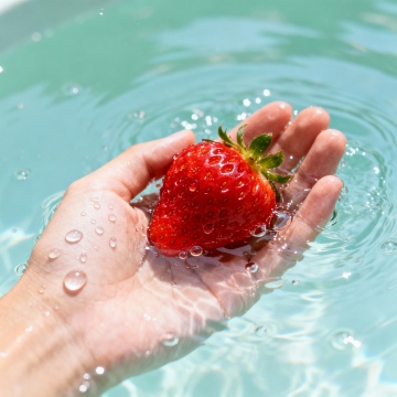 一堆新鲜饱满的草莓,表面覆盖着晶莹的水珠,散发着诱人的光泽,草莓的叶子呈现出鲜亮的绿色,背景为红色,整体画面色彩鲜艳,充满了生机与活力,具有高度的写实感和细腻的质感表现,光影效果突出,营造出一种新鲜、美味的氛围。